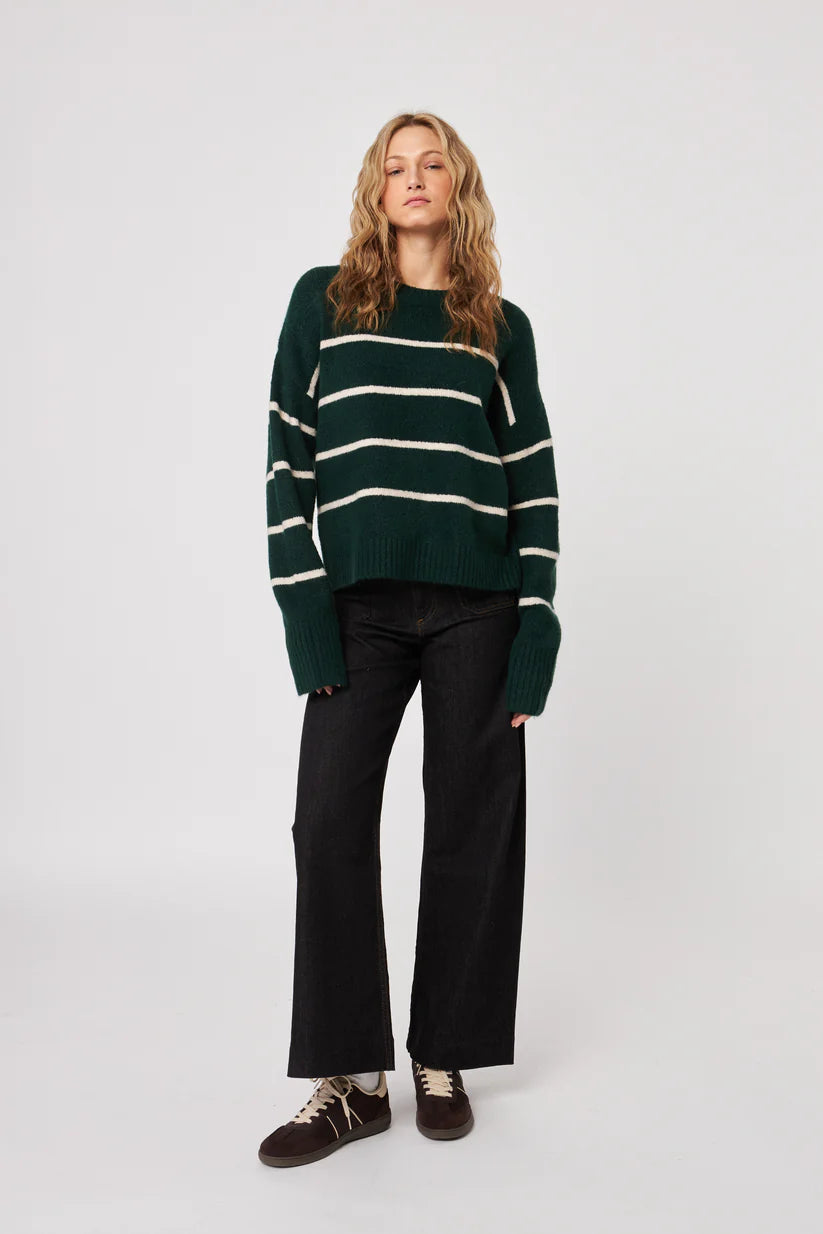 Get cozy with the Rila Roscoe Sweater in Spruce! This soft knit pullover features a fun contrast stripe and extra long sleeves, making it your go-to for chilly days. Whether layered up or worn solo, it adds a playful pop to your style while keeping you comfortably warm.