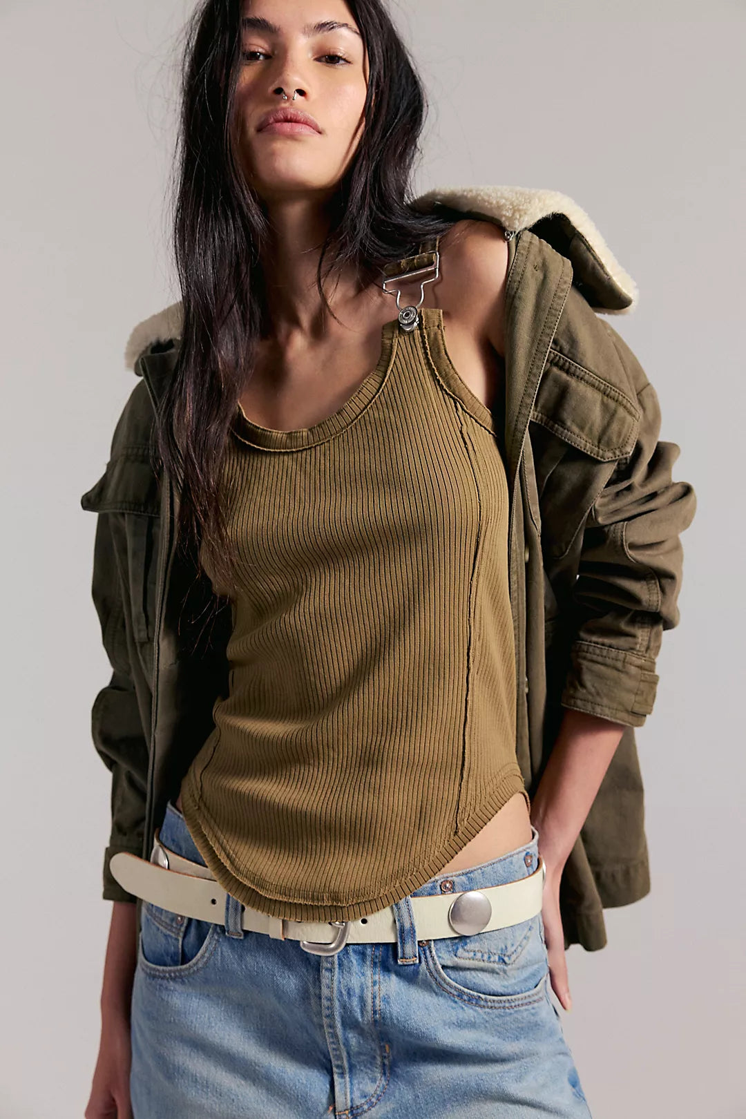 We The Free's Jamie Buckle Tank transforms a classic staple into something unexpectedly cool. Crafted from soft ribbed cotton with a fitted silhouette, this scoop-neck tank features overall-inspired straps anchored with edgy buckle-loop hardware that steals the show. The rounded hem keeps things polished while those metal details deliver serious attitude. Perfect for layering or wearing solo—this is the tank that does more.
