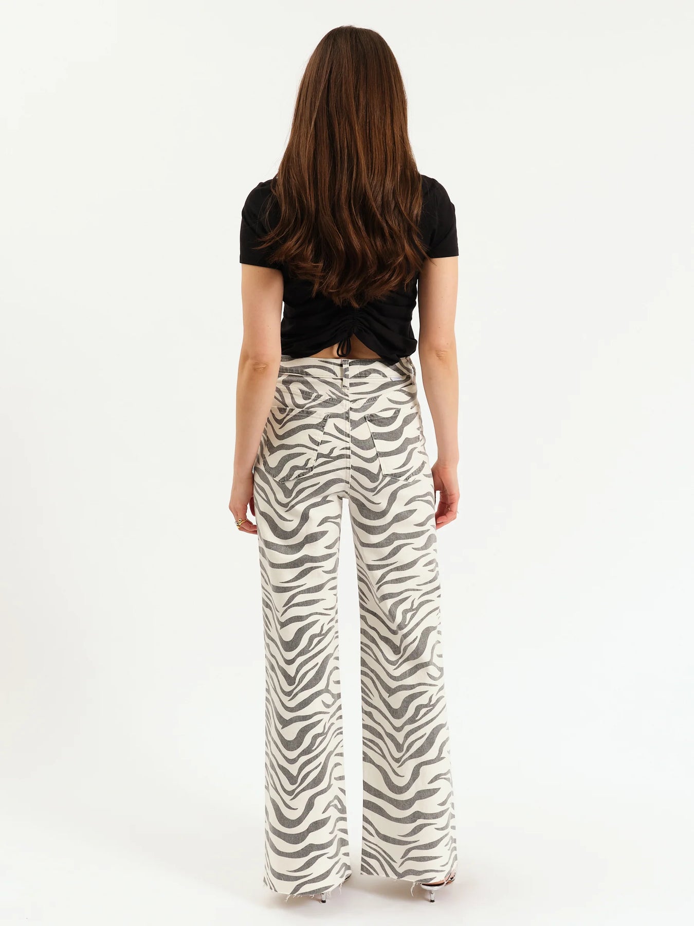 How far will you go in the Far Out Flare? This cool girl jean rocks a bold zebra print that turns heads everywhere. The high-rise cut with twisted seams creates an instantly flattering silhouette that elongates your legs, while our signature "hug" denim hugs your curves without sacrificing structure. The wide-leg silhouette gives you that effortless, statement-making vibe. Perfect for anyone ready to stand out.